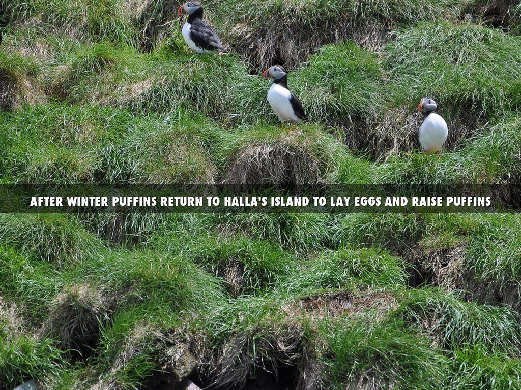 AFTER WINTER PUFFINS RETURN TO HALLA'S ISLAND TO LAY EGGS AND RAISE PUFFINS