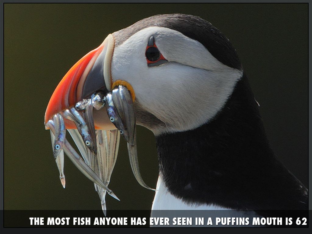 THE MOST FISH ANYONE HAS EVER SEEN IN A PUFFINS MOUTH IS 62