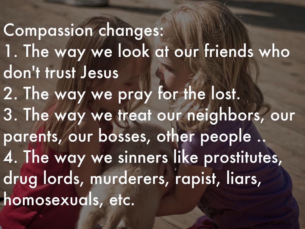 Compassion changes: 1. The way we look at our friends who don't trust Jesus 2. The way we pray for the lost. 3. The way we treat our neighbors, our parents, our bosses, other people .. 4. The way we sinners like prostitutes, drug lords, murderers, rapist, liars, homosexuals, etc.