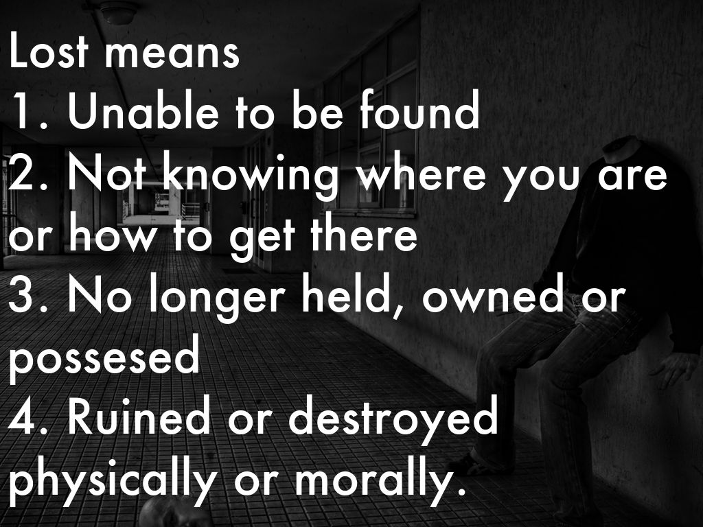 Lost means 1. Unable to be found 2. Not knowing where you are or how to get there 3. No longer held, owned or possesed 4. Ruined or destroyed physically or morally.