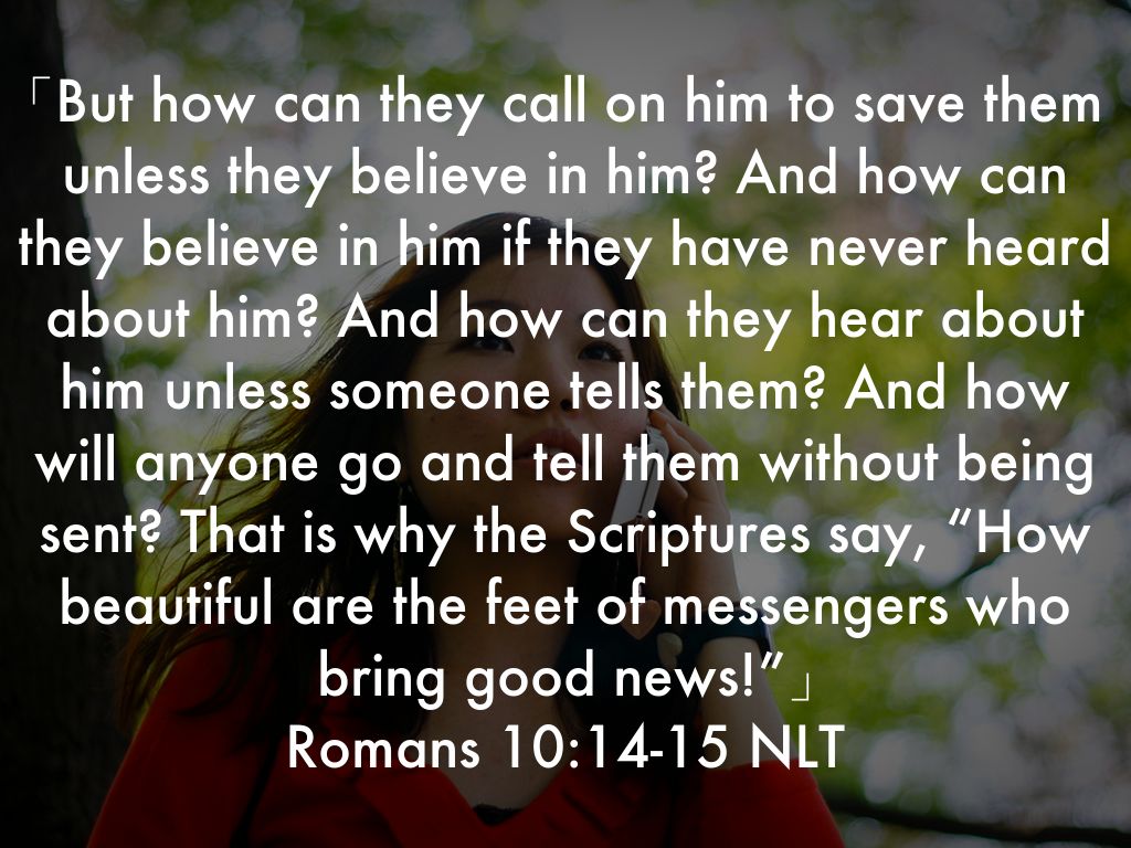 「But how can they call on him to save them unless they believe in him? And how can they believe in him if they have never heard about him? And how can they hear about him unless someone tells them? And how will anyone go and tell them without being sent? That is why the Scriptures say, “How beautiful are the feet of messengers who bring good news!”」 Romans 10:14-15 NLT