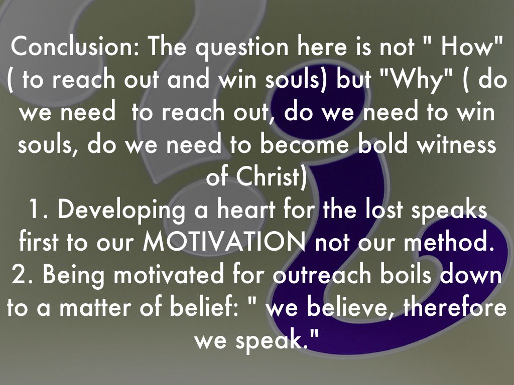 Conclusion: The question here is not " How" ( to reach out and win souls) but "Why" ( do we need to reach out, do we need to win souls, do we need to become bold witness of Christ) 1. Developing a heart for the lost speaks first to our MOTIVATION not our method. 2. Being motivated for outreach boils down to a matter of belief: " we believe, therefore we speak."