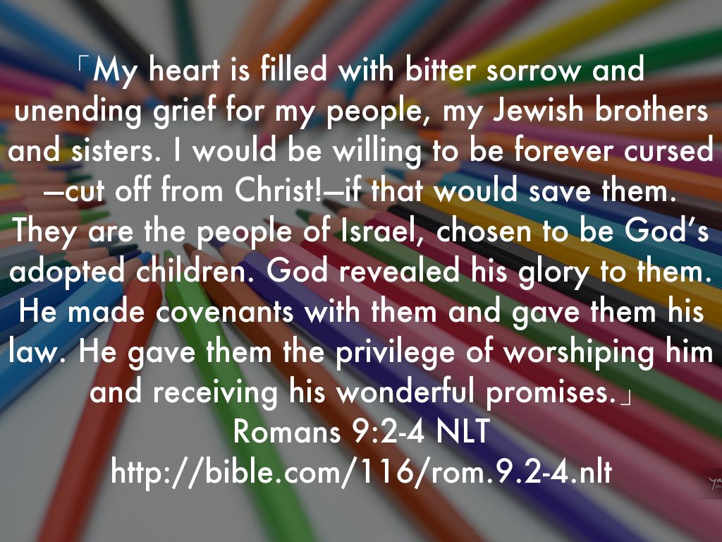 「My heart is filled with bitter sorrow and unending grief for my people, my Jewish brothers and sisters. I would be willing to be forever cursed—cut off from Christ!—if that would save them. They are the people of Israel, chosen to be God’s adopted children. God revealed his glory to them. He made covenants with them and gave them his law. He gave them the privilege of worshiping him and receiving his wonderful promises.」 Romans 9:2-4 NLT http://bible.com/116/rom.9.2-4.nlt