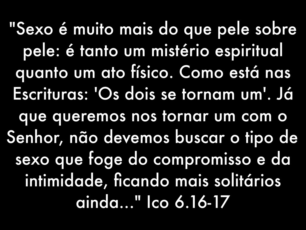 "Sexo é muito mais do que pele sobre pele: é tanto um mistério espiritual quanto um ato físico. Como está nas Escrituras: 'Os dois se tornam um'. Já que queremos nos tornar um com o Senhor, não devemos buscar o tipo de sexo que foge do compromisso e da intimidade, ficando mais solitários ainda..." Ico 6.16-17