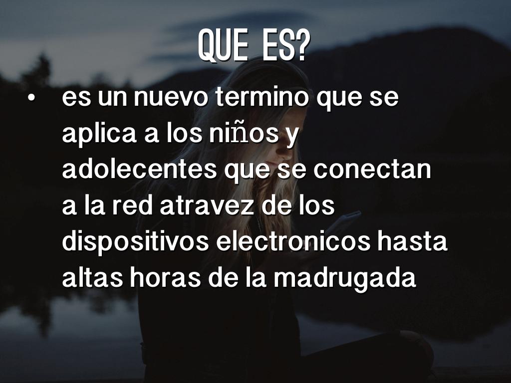 es un nuevo termino que se aplica a los niños y adolecentes que se conectan a la red atravez de los dispositivos electronicos hasta altas horas de la madrugada