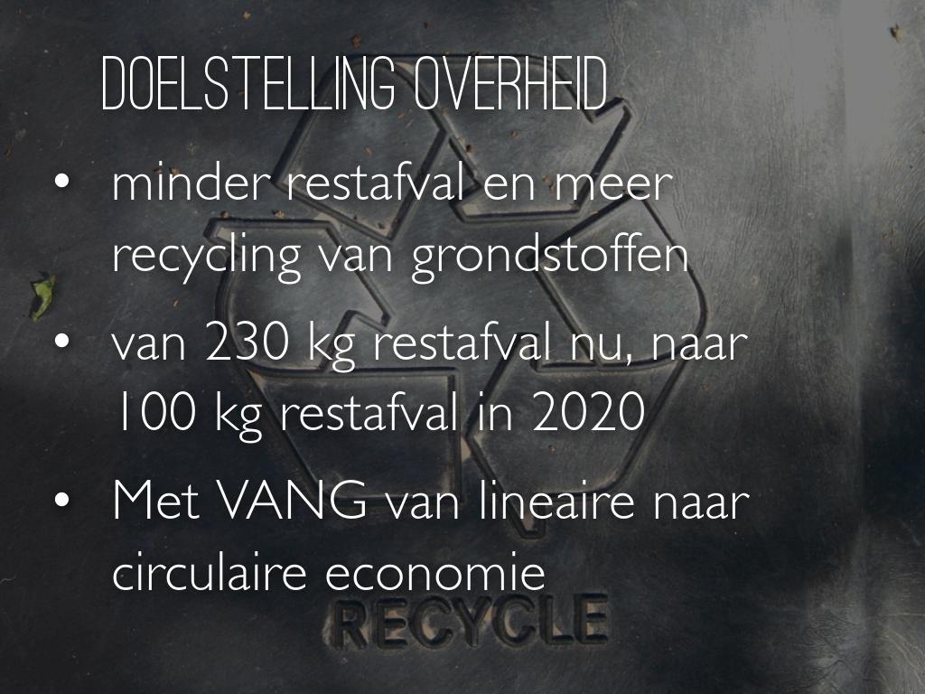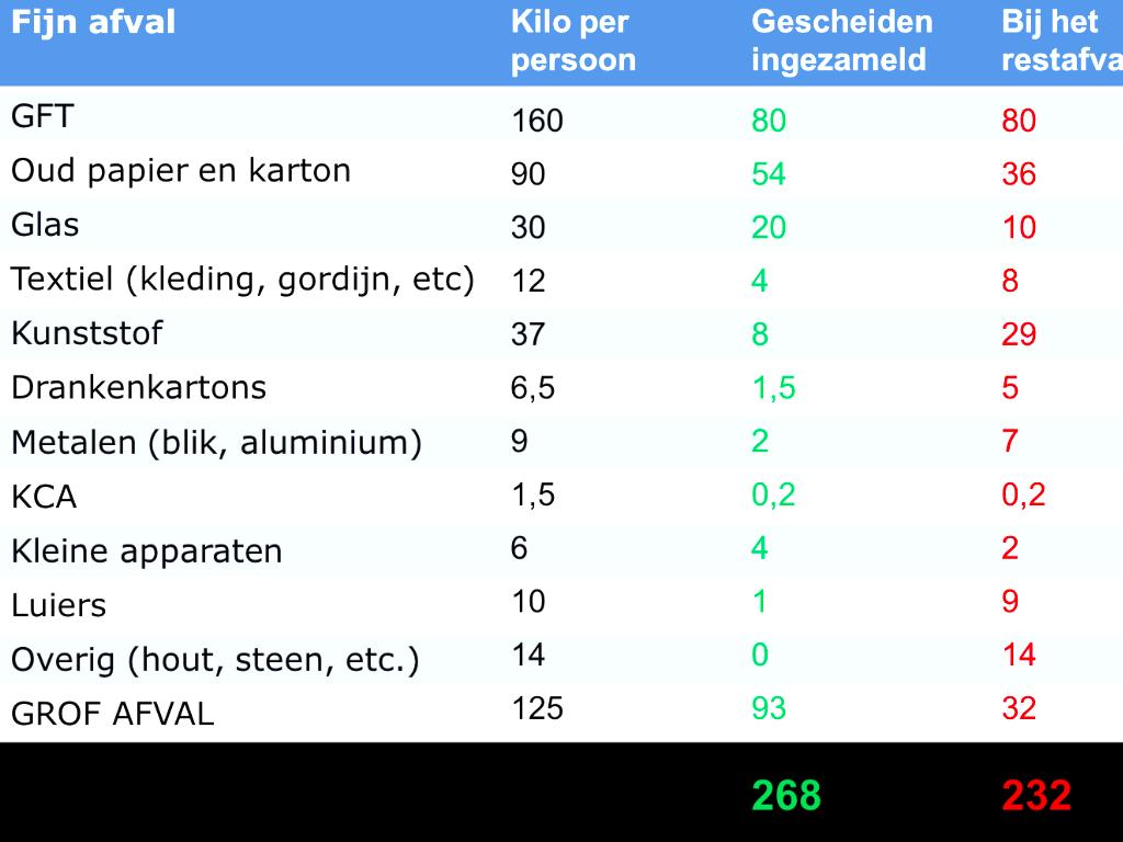 - van 230 kg restafval nu, naar 100 kg restafval in 2020