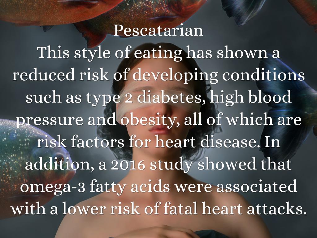 Pescatarian This style of eating has shown a reduced risk of developing conditions such as type 2 diabetes, high blood pressure and obesity, all of which are risk factors for heart disease. In addition, a 2016 study showed that omega-3 fatty acids were associated with a lower risk of fatal heart attacks.