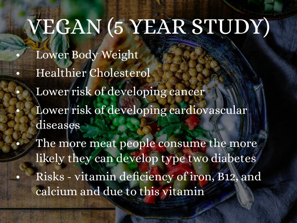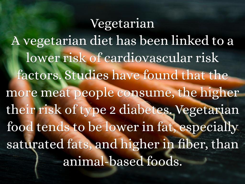 Vegetarian A vegetarian diet has been linked to a lower risk of cardiovascular risk factors. Studies have found that the more meat people consume, the higher their risk of type 2 diabetes. Vegetarian food tends to be lower in fat, especially saturated fats, and higher in fiber, than animal-based foods.