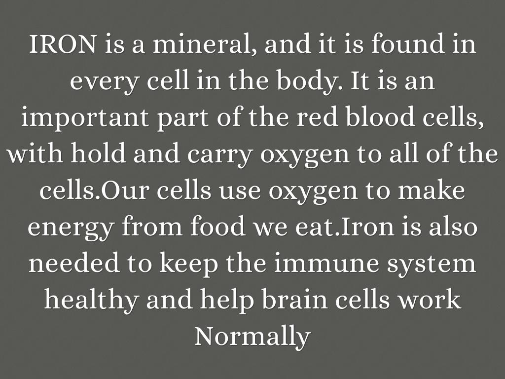 IRON is a mineral, and it is found in every cell in the body. It is an important part of the red blood cells, with hold and carry oxygen to all of the cells.Our cells use oxygen to make energy from food we eat.Iron is also needed to keep the immune system healthy and help brain cells work Normally