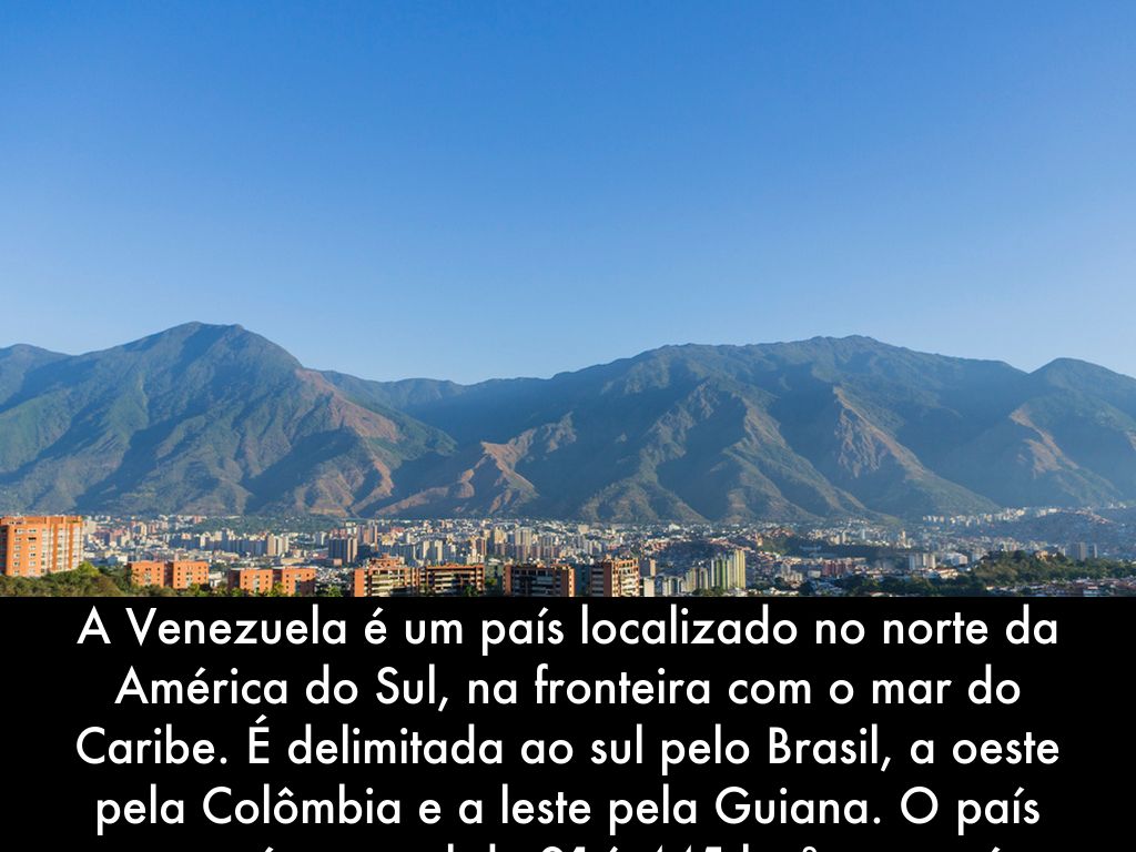 A Venezuela é um país localizado no norte da América do Sul, na fronteira com o mar do Caribe. É delimitada ao sul pelo Brasil, a oeste pela Colômbia e a leste pela Guiana. O país tem uma área total de 916 445 km² e uma área terrestre de 882 050 km²