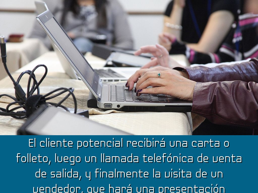 El cliente potencial recibirá una carta o folleto, luego un llamada telefónica de venta de salida, y finalmente la visita de un vendedor, que hará una presentación destinada a cerrar la venta.