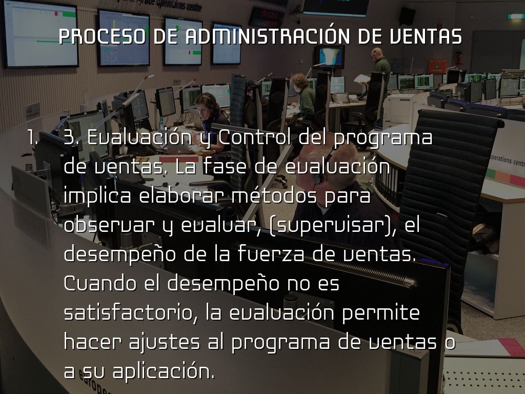 3. Evaluación y Control del programa de ventas. La fase de evaluación implica elaborar métodos para observar y evaluar, (supervisar), el desempeño de la fuerza de ventas. Cuando el desempeño no es satisfactorio, la evaluación permite hacer ajustes al programa de ventas o a su aplicación.