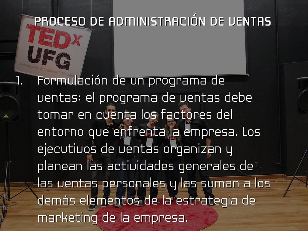 Formulación de un programa de ventas: el programa de ventas debe tomar en cuenta los factores del entorno que enfrenta la empresa. Los ejecutivos de ventas organizan y planean las actividades generales de las ventas personales y las suman a los demás elementos de la estrategia de marketing de la empresa.