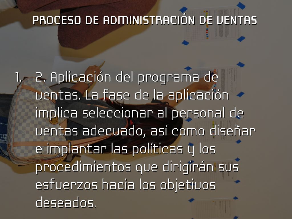 2. Aplicación del programa de ventas. La fase de la aplicación implica seleccionar al personal de ventas adecuado, así como diseñar e implantar las políticas y los procedimientos que dirigirán sus esfuerzos hacia los objetivos deseados.