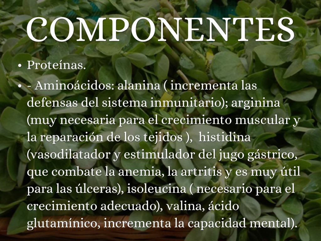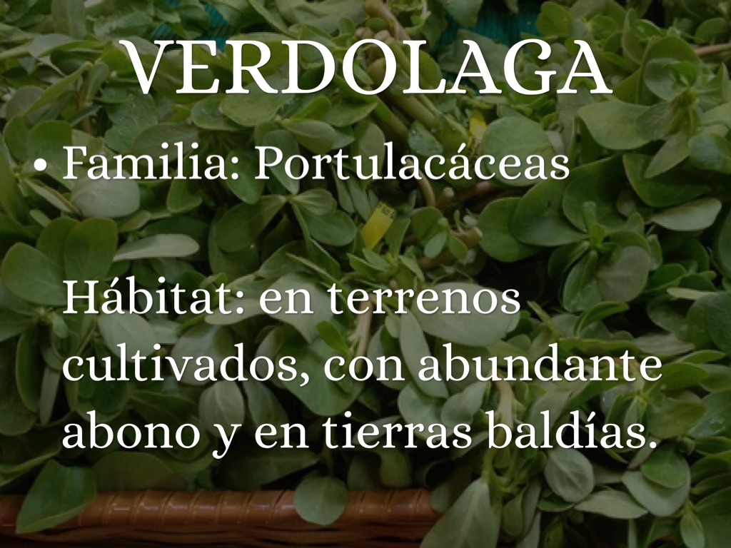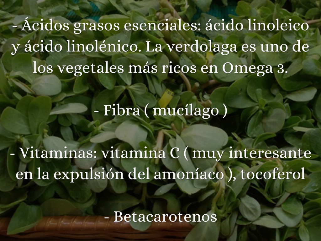 - Ácidos grasos esenciales: ácido linoleico y ácido linolénico. La verdolaga es uno de los vegetales más ricos en Omega 3.