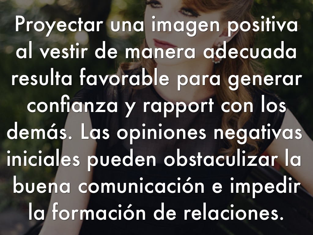 Proyectar una imagen positiva al vestir de manera adecuada resulta favorable para generar confianza y rapport con los demás. Las opiniones negativas iniciales pueden obstaculizar la buena comunicación e impedir la formación de relaciones.