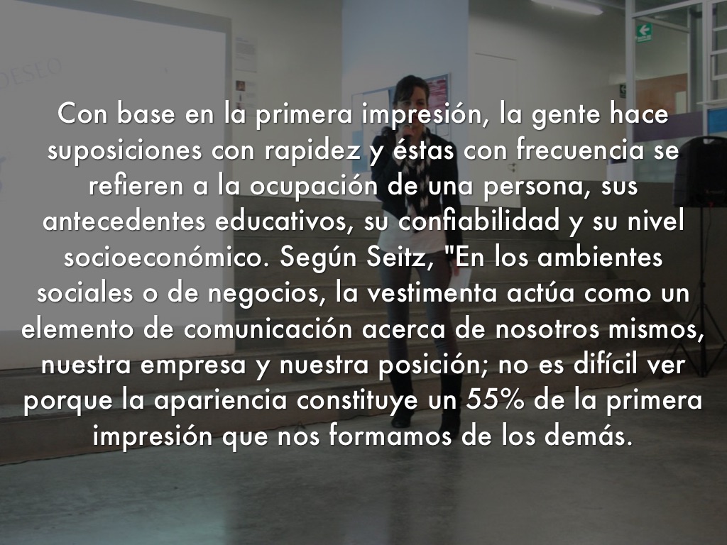 Con base en la primera impresión, la gente hace suposiciones con rapidez y éstas con frecuencia se refieren a la ocupación de una persona, sus antecedentes educativos, su confiabilidad y su nivel socioeconómico. Según Seitz, "En los ambientes sociales o de negocios, la vestimenta actúa como un elemento de comunicación acerca de nosotros mismos, nuestra empresa y nuestra posición; no es difícil ver porque la apariencia constituye un 55% de la primera impresión que nos formamos de los demás.