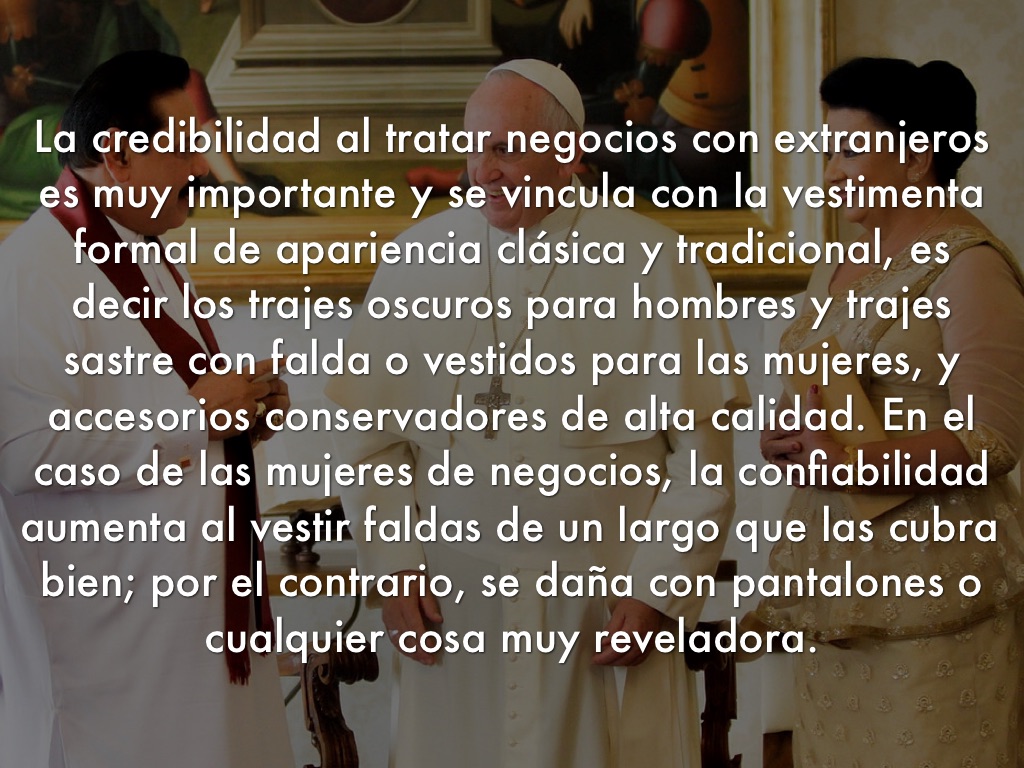 La credibilidad al tratar negocios con extranjeros es muy importante y se vincula con la vestimenta formal de apariencia clásica y tradicional, es decir los trajes oscuros para hombres y trajes sastre con falda o vestidos para las mujeres, y accesorios conservadores de alta calidad. En el caso de las mujeres de negocios, la confiabilidad aumenta al vestir faldas de un largo que las cubra bien; por el contrario, se daña con pantalones o cualquier cosa muy reveladora.