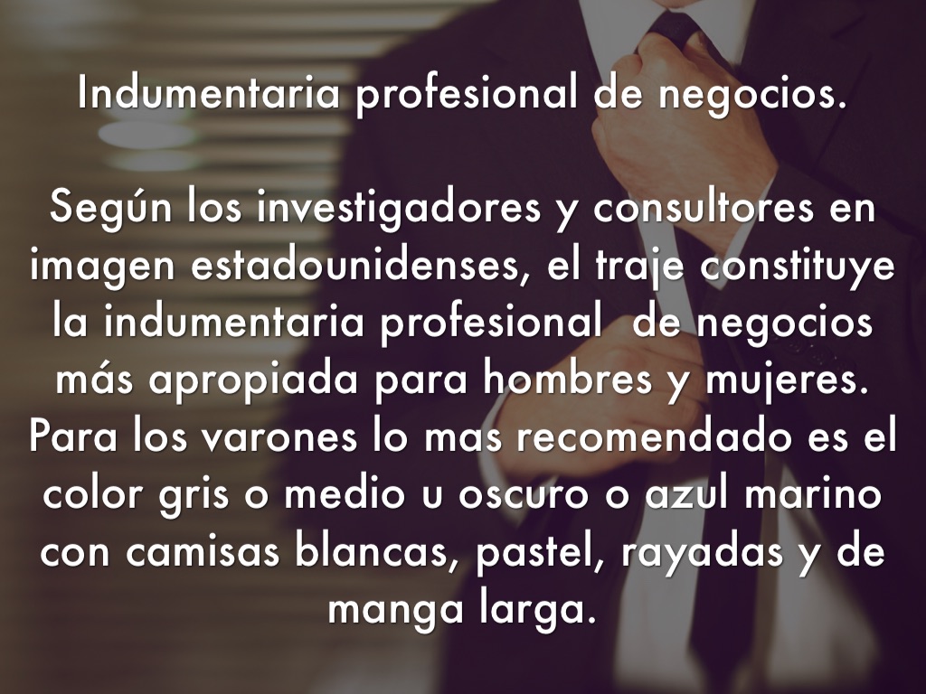 Según los investigadores y consultores en imagen estadounidenses, el traje constituye la indumentaria profesional de negocios más apropiada para hombres y mujeres. Para los varones lo mas recomendado es el color gris o medio u oscuro o azul marino con camisas blancas, pastel, rayadas y de manga larga.
