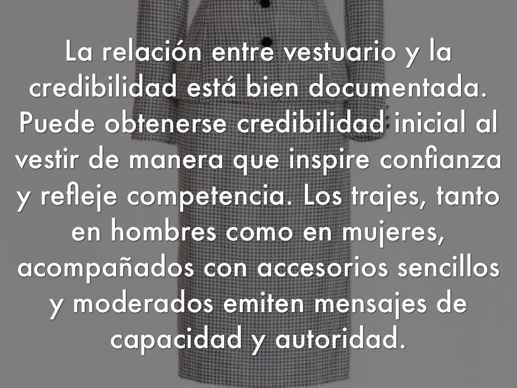 La relación entre vestuario y la credibilidad está bien documentada. Puede obtenerse credibilidad inicial al vestir de manera que inspire confianza y refleje competencia. Los trajes, tanto en hombres como en mujeres, acompañados con accesorios sencillos y moderados emiten mensajes de capacidad y autoridad.