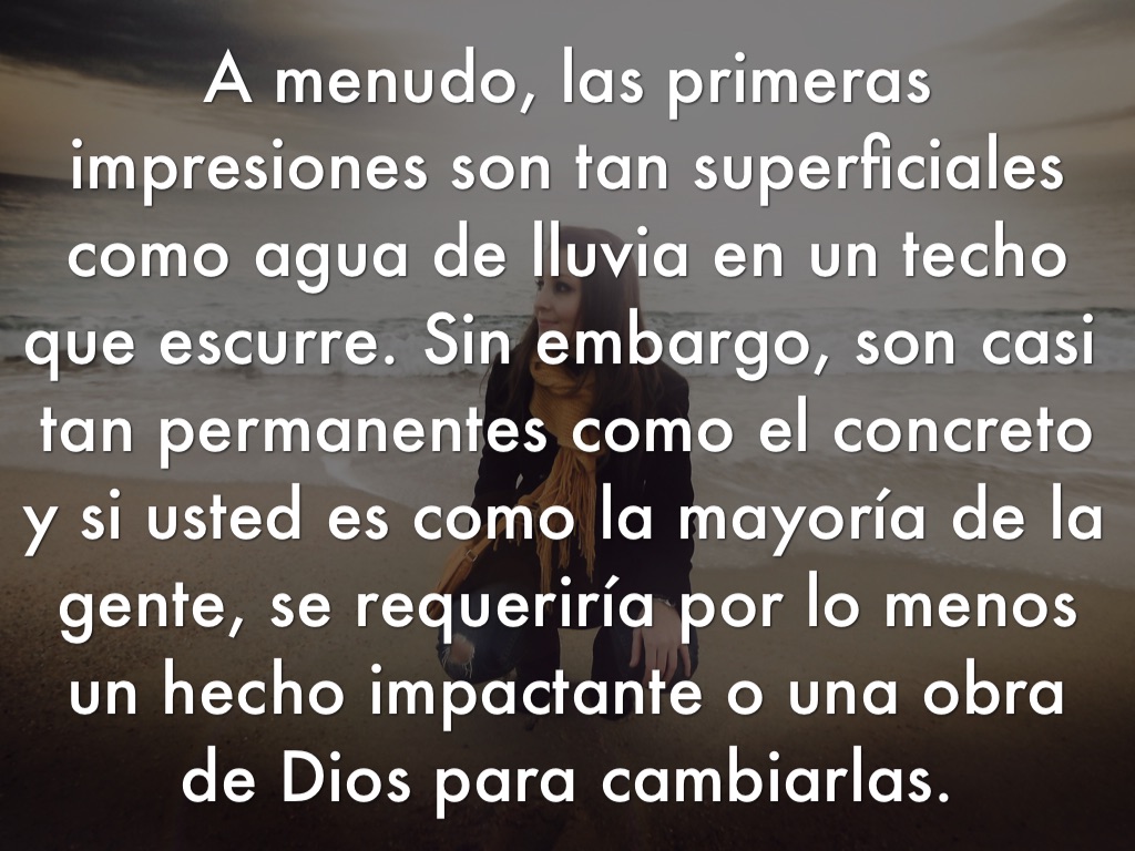 A menudo, las primeras impresiones son tan superficiales como agua de lluvia en un techo que escurre. Sin embargo, son casi tan permanentes como el concreto y si usted es como la mayoría de la gente, se requeriría por lo menos un hecho impactante o una obra de Dios para cambiarlas.