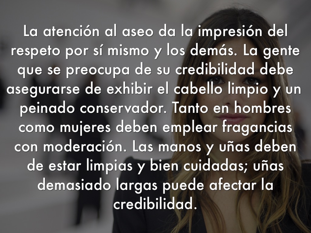 La atención al aseo da la impresión del respeto por sí mismo y los demás. La gente que se preocupa de su credibilidad debe asegurarse de exhibir el cabello limpio y un peinado conservador. Tanto en hombres como mujeres deben emplear fragancias con moderación. Las manos y uñas deben de estar limpias y bien cuidadas; uñas demasiado largas puede afectar la credibilidad.