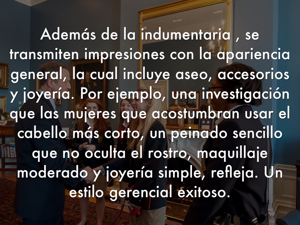 Además de la indumentaria , se transmiten impresiones con la apariencia general, la cual incluye aseo, accesorios y joyería. Por ejemplo, una investigación que las mujeres que acostumbran usar el cabello más corto, un peinado sencillo que no oculta el rostro, maquillaje moderado y joyería simple, refleja. Un estilo gerencial exitoso.