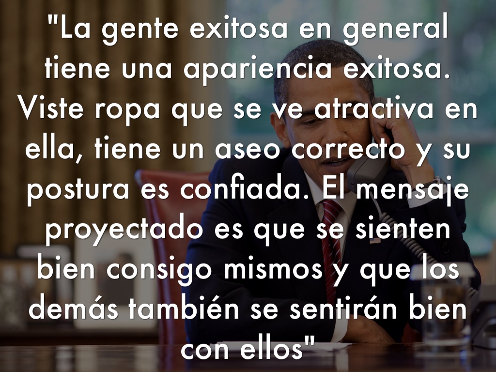 "La gente exitosa en general tiene una apariencia exitosa. Viste ropa que se ve atractiva en ella, tiene un aseo correcto y su postura es confiada. El mensaje proyectado es que se sienten bien consigo mismos y que los demás también se sentirán bien con ellos"