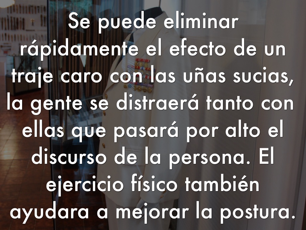 Se puede eliminar rápidamente el efecto de un traje caro con las uñas sucias, la gente se distraerá tanto con ellas que pasará por alto el discurso de la persona. El ejercicio físico también ayudara a mejorar la postura.