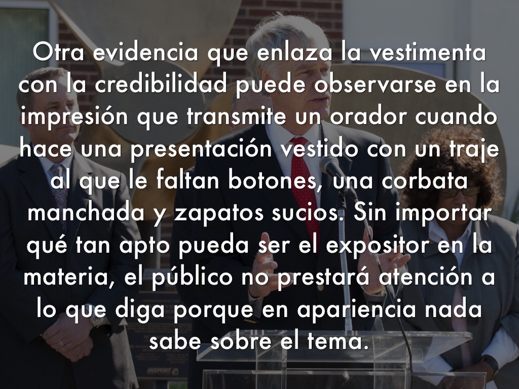 Otra evidencia que enlaza la vestimenta con la credibilidad puede observarse en la impresión que transmite un orador cuando hace una presentación vestido con un traje al que le faltan botones, una corbata manchada y zapatos sucios. Sin importar qué tan apto pueda ser el expositor en la materia, el público no prestará atención a lo que diga porque en apariencia nada sabe sobre el tema.