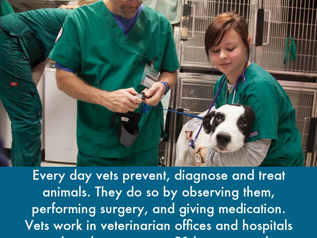 Every day vets prevent, diagnose and treat animals. They do so by observing them, performing surgery, and giving medication.