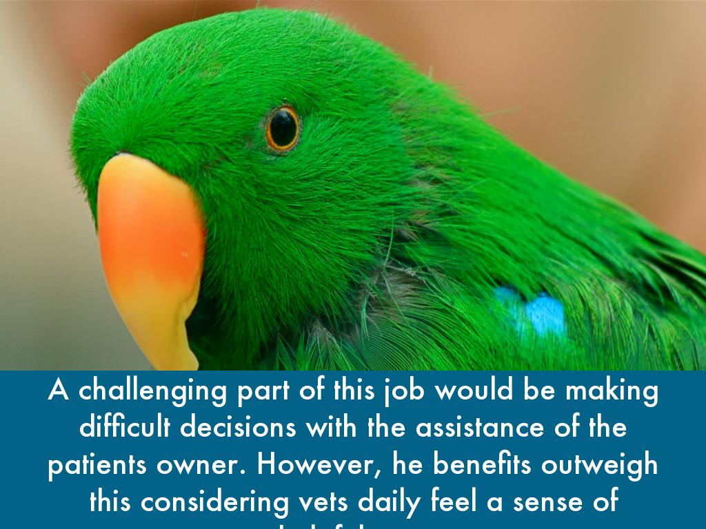 A challenging part of this job would be making difficult decisions with the assistance of the patients owner. However, he benefits outweigh this considering vets daily feel a sense of helpfulness.