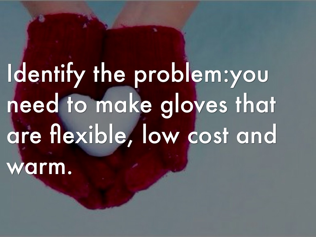 Identify the problem:you need to make gloves that are flexible, low cost and warm.
