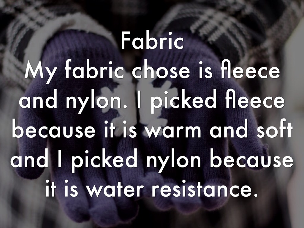 My fabric chose is fleece and nylon. I picked fleece because it is warm and soft and I picked nylon because it is water resistance.