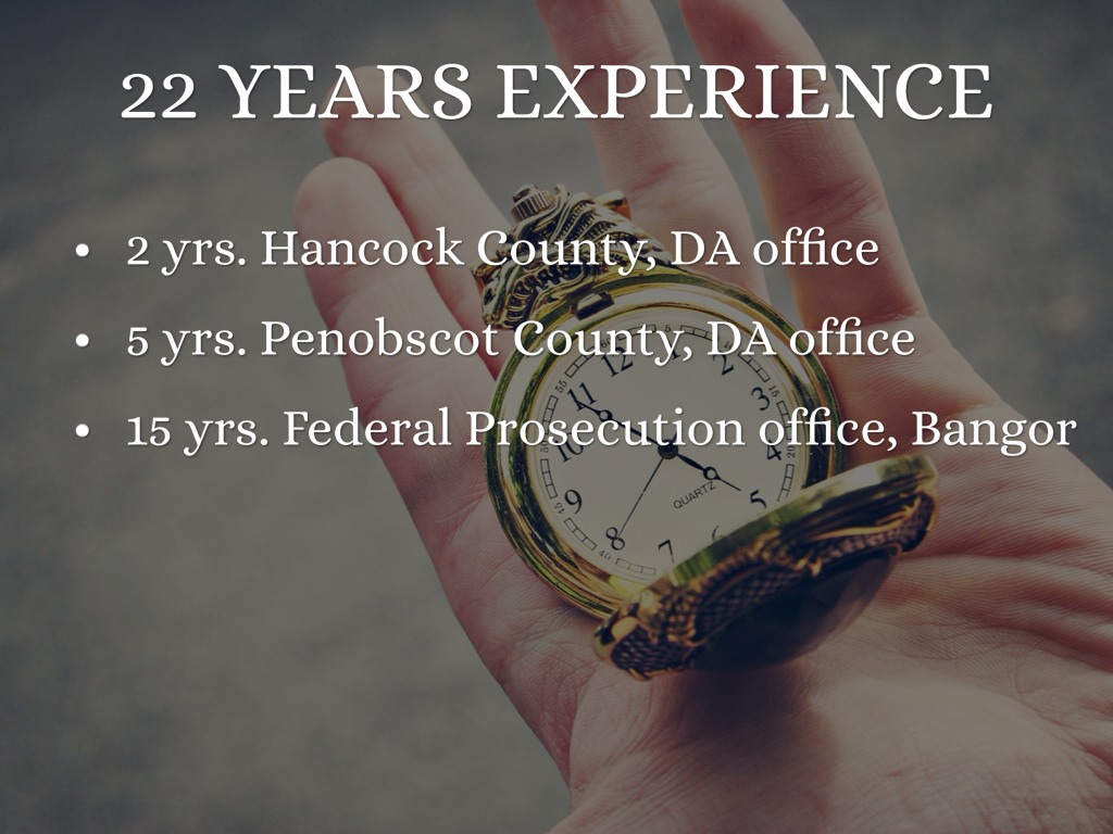 15 yrs. Federal Prosecution office, Bangor