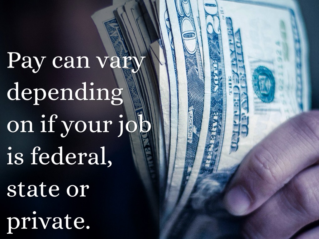 Pay can vary depending on if your job is federal, state or private.