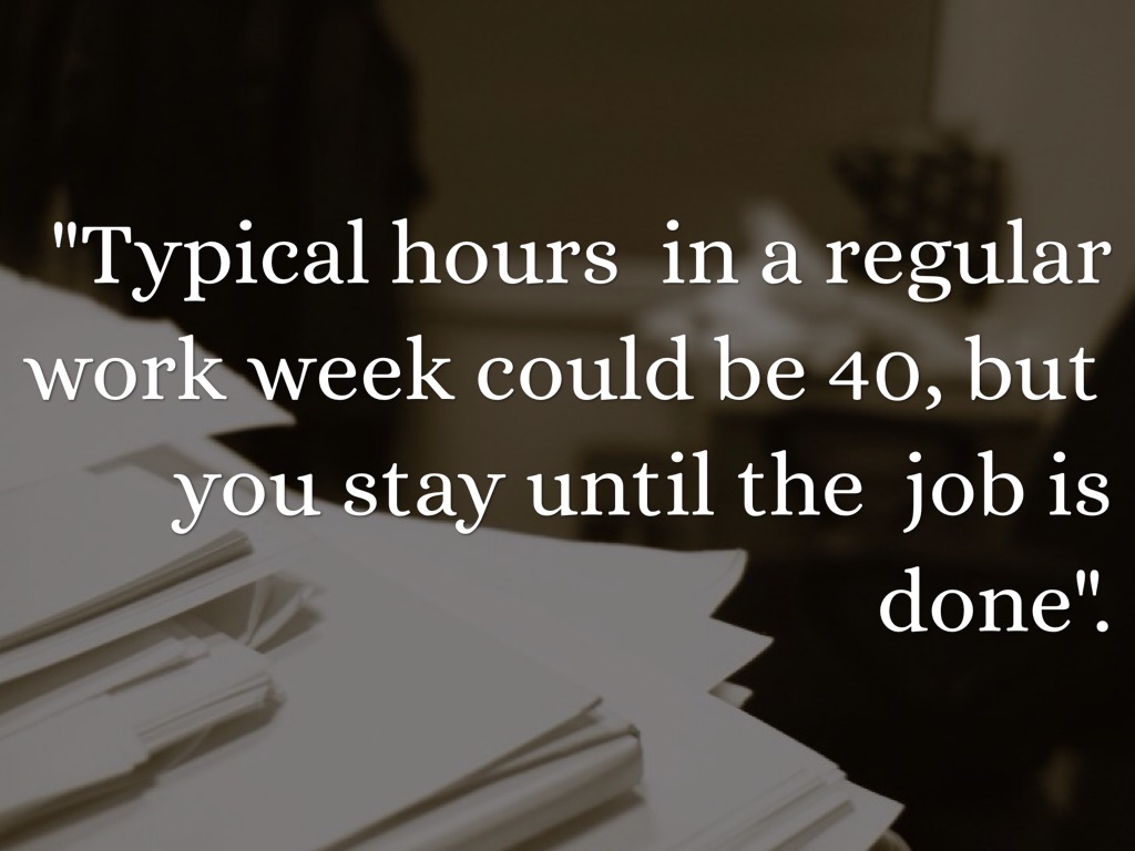 "Typical hours in a regular work week could be 40, but you stay until the job is done".