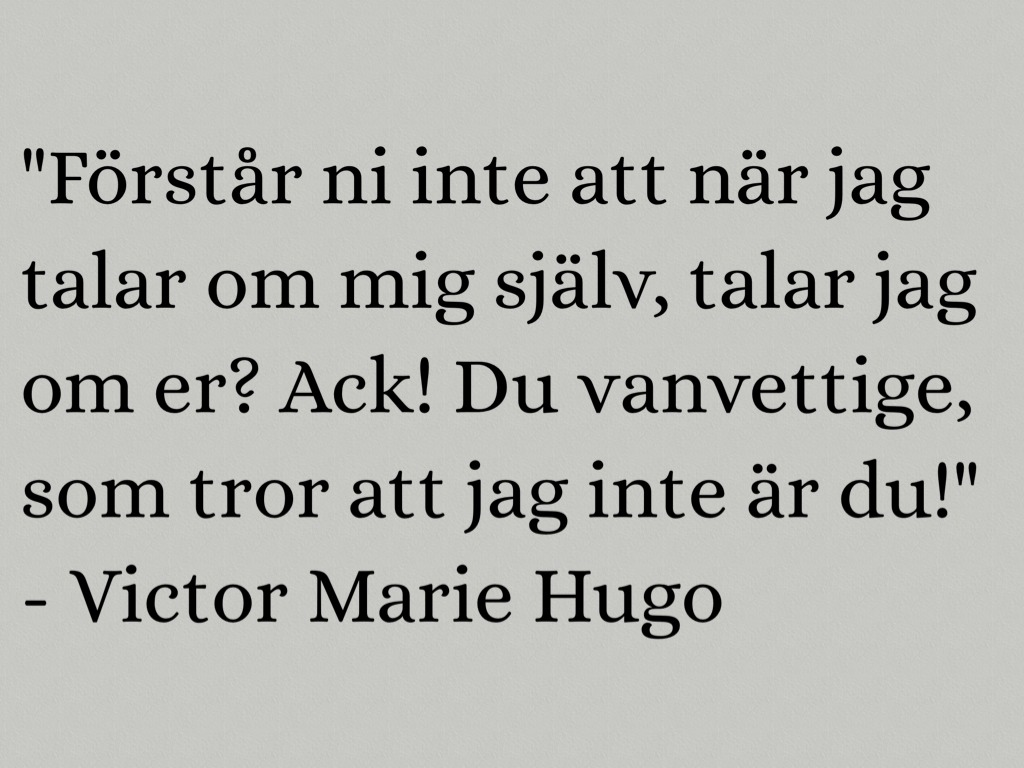 "Förstår ni inte att när jag talar om mig själv, talar jag om er? Ack! Du vanvettige, som tror att jag inte är du!" - Victor Marie Hugo