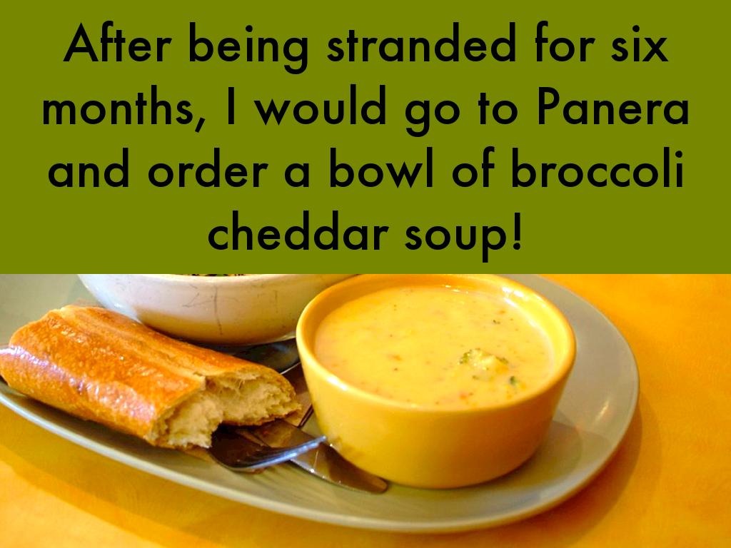 After being stranded for six months, I would go to Panera and order a bowl of broccoli cheddar soup!