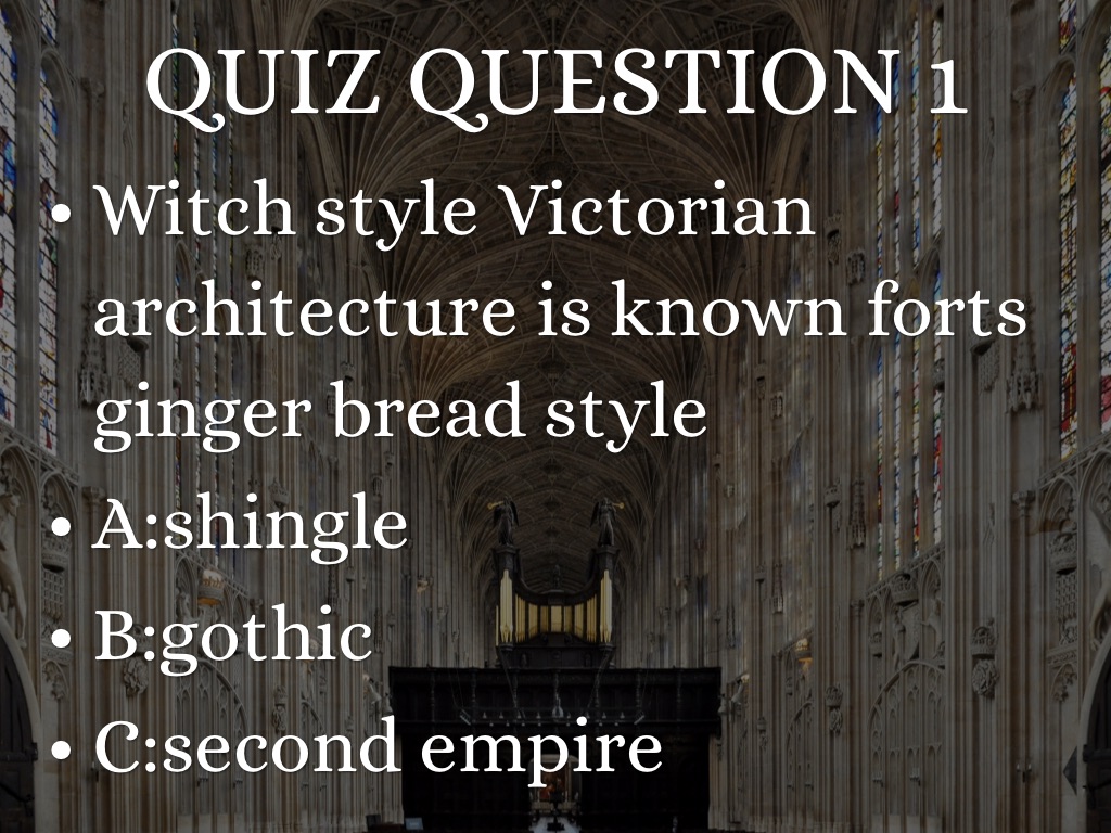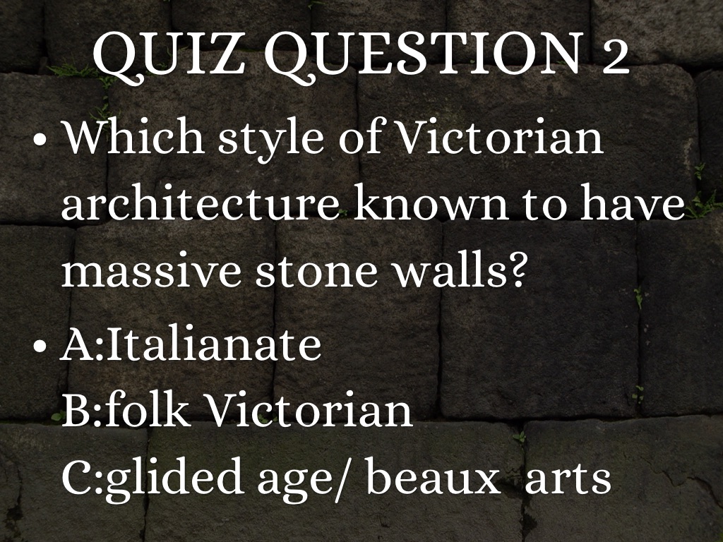 A:Italianate B:folk Victorian C:glided age/ beaux arts