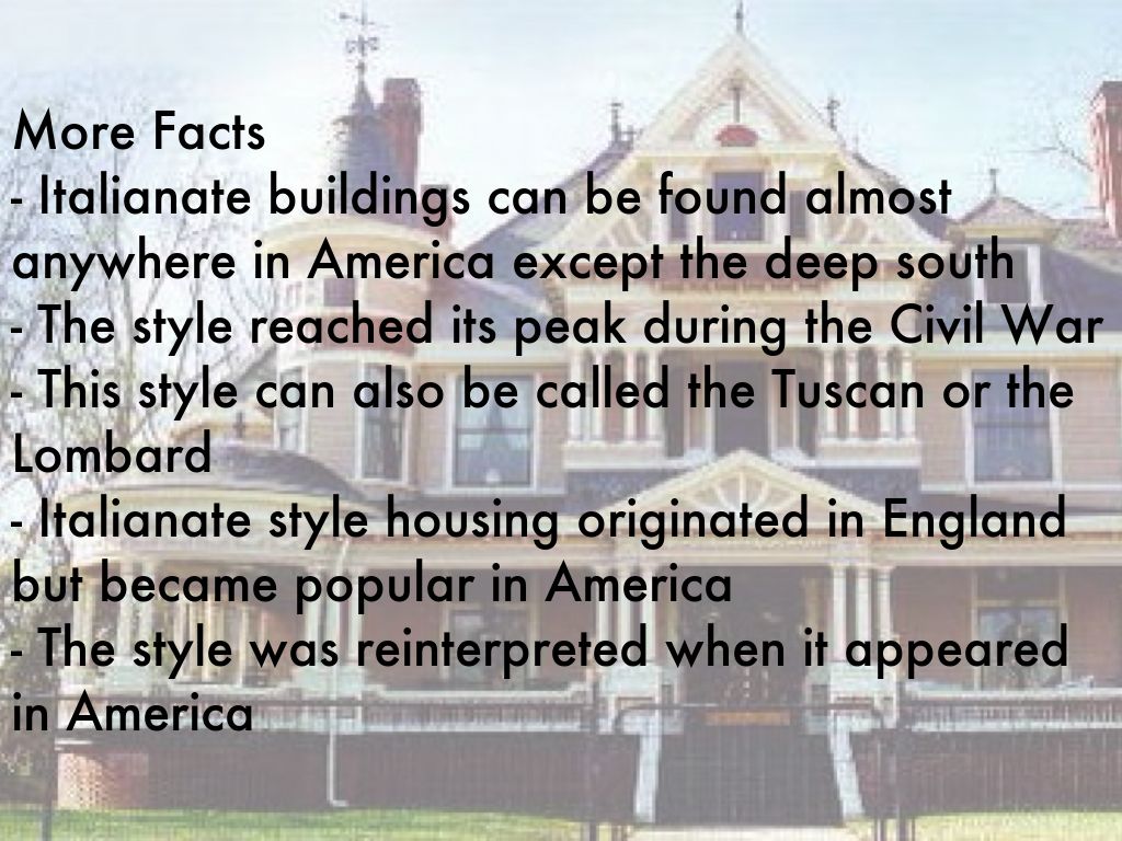 - Italianate buildings can be found almost anywhere in America except the deep south
