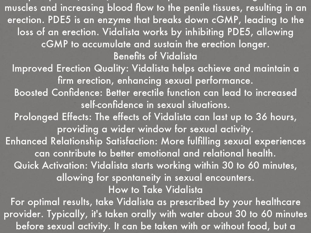 How Does Vidalista 60 mg Work? The active ingredient in Vidalista 60 mg, Tadalafil, works by inhibiting the enzyme phosphodiesterase type 5 (PDE5). This inhibition leads to increased levels of cGMP (cyclic guanosine monophosphate), causing the relaxation of smooth muscles and improved blood flow to the penis. This process helps men achieve and maintain an erection sufficient for sexual activity when they are sexually stimulated.