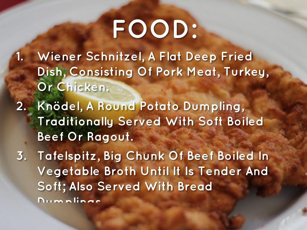 - Wiener Schnitzel, A Flat Deep Fried Dish, Consisting Of Pork Meat, Turkey, Or Chicken.