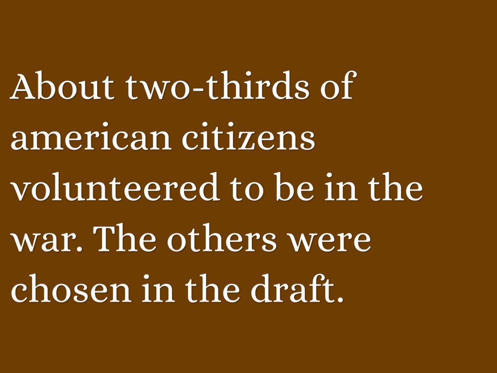 About two-thirds of american citizens volunteered to be in the war. The others were chosen in the draft.