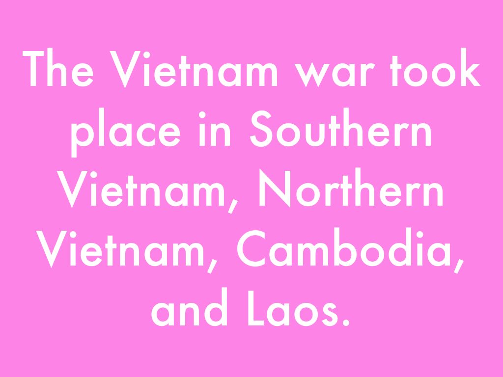 The Vietnam war took place in Southern Vietnam, Northern Vietnam, Cambodia, and Laos.