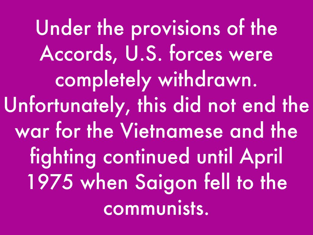 Under the provisions of the Accords, U.S. forces were completely withdrawn. Unfortunately, this did not end the war for the Vietnamese and the fighting continued until April 1975 when Saigon fell to the communists.