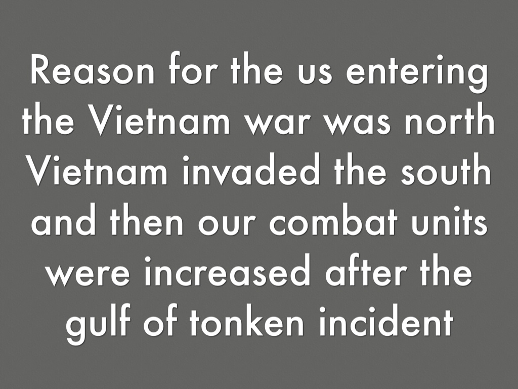 Reason for the us entering the Vietnam war was north Vietnam invaded the south and then our combat units were increased after the gulf of tonken incident