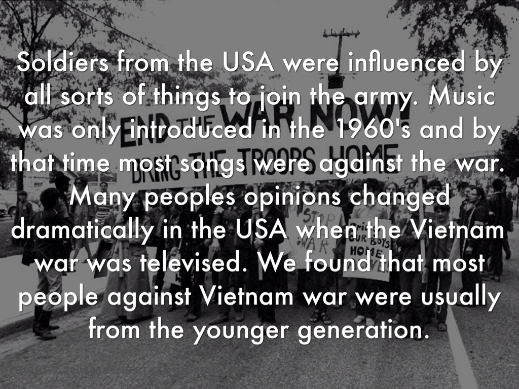 Soldiers from the USA were influenced by all sorts of things to join the army. Music was only introduced in the 1960's and by that time most songs were against the war. Many peoples opinions changed dramatically in the USA when the Vietnam war was televised. We found that most people against Vietnam war were usually from the younger generation.