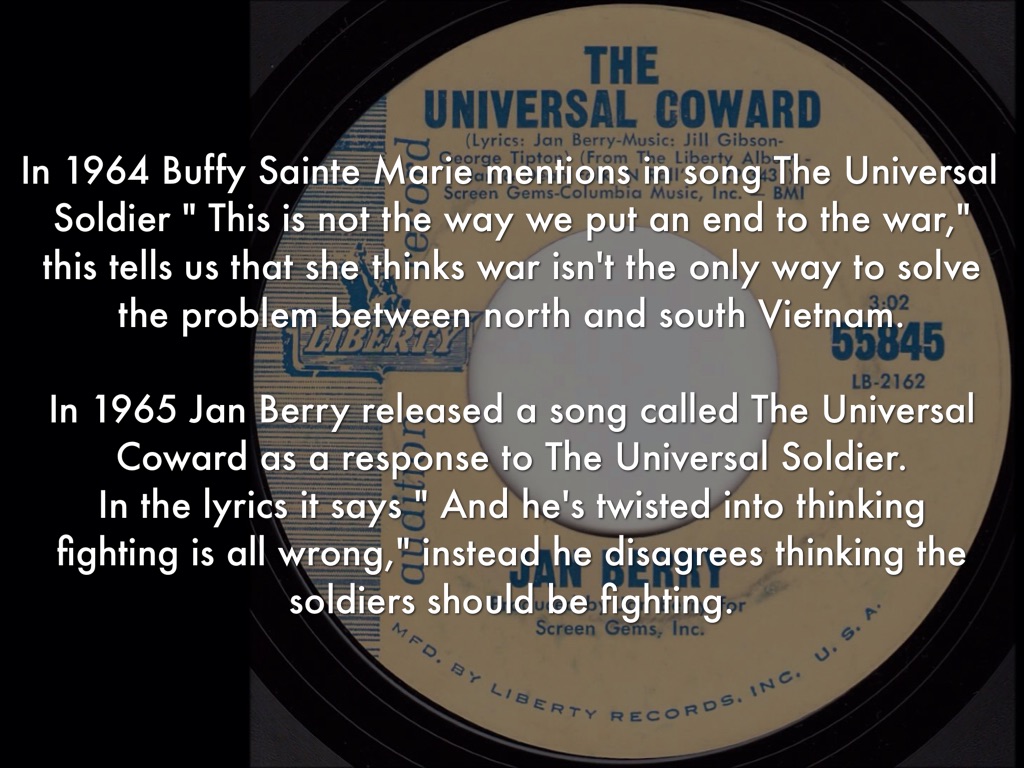 In 1964 Buffy Sainte Marie mentions in song The Universal Soldier " This is not the way we put an end to the war," this tells us that she thinks war isn't the only way to solve the problem between north and south Vietnam.