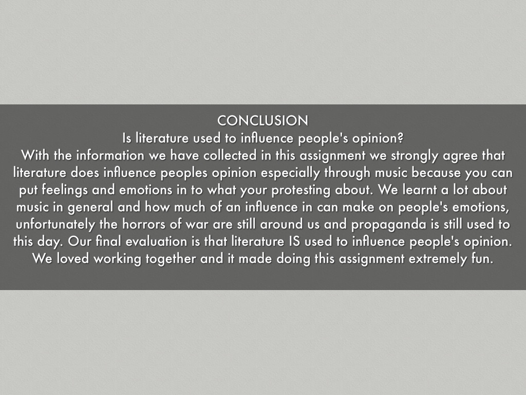 With the information we have collected in this assignment we strongly agree that literature does influence peoples opinion especially through music because you can put feelings and emotions in to what your protesting about. We learnt a lot about music in general and how much of an influence in can make on people's emotions, unfortunately the horrors of war are still around us and propaganda is still used to this day. Our final evaluation is that literature IS used to influence people's opinion. We loved working together and it made doing this assignment extremely fun.